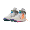 De witte uitvoering (Artikelnr: DO6290-100) valt op door zijn bovenwerk van lichtgewicht, ademend mesh met een houtnerf-patroon. Dit geeft de schoen een organische maar industriële look. De iconische “Air”-branding op de tong en de bekende Helvetica-tekst aan de binnenzijde van de voet zijn onmiskenbare Off-White details die de authenticiteit van het ontwerp bevestigen.